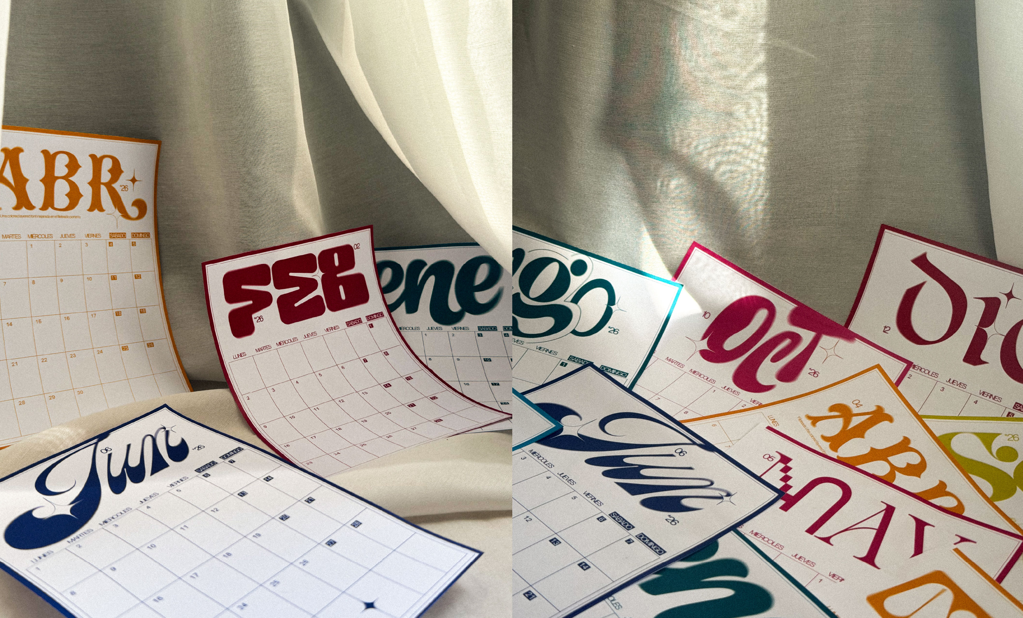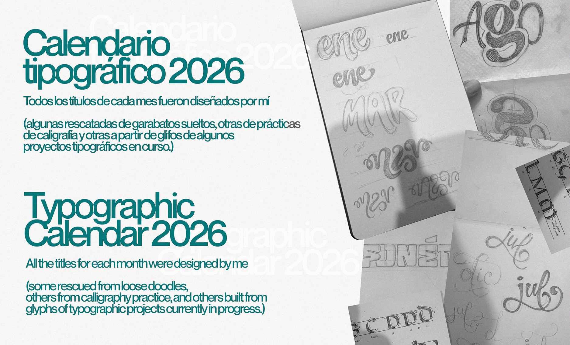 Cada mes tiene un título con lettering diseñado a mano, creado a partir de garabatos, prácticas de caligrafía y proyectos tipográficos en curso. Un proyecto personal para dejar salir mis letras y, ojalá, acompañarte durante todo el año.